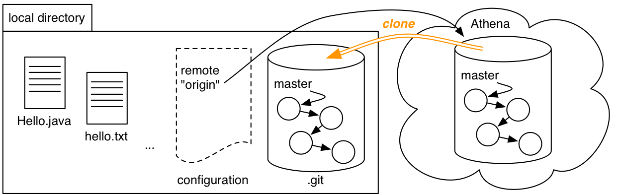 To perform the merge, he pulls her commit from Athena, which does two things: