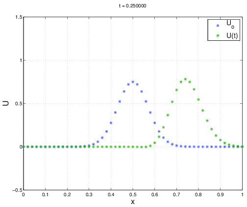 Figures 2.10, 2.11, and 2.12 plot the finite difference solution at times \(t=0.25, t=0.5\) and \(t=1.0\). The exact solution for this problem has \(U(x,t) = U_0(x)\) for any integer time \((t=1,2, \ldots ).\). When the numerical method is run, the Gaussian disturbance is convected across the domain, however small oscillations are observed at \(t=0.5\) which begin to pollute the numerical solution. Eventually, these oscillations grow until the entire solution is contaminated. We will later show that the \(FTCS\) algorithm is unstable for any \(\Delta t\) for pure convection. Thus, what we are observing is an instability that can be predicted through some analysis.