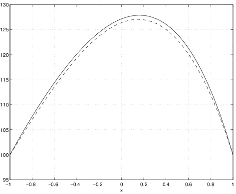 One approach to determine the \(N\) unknown values of \(a_ j\) would be to enforce the governing PDE at \(N\) spatial points in the domain (i.e., to make sure that the the approximate solution exactly satisfies the PDE at \(N\) points). Note that in general, the exact solution will not be a linear combination of the \(\phi _ j(x)\), so it will not be possible for our approximate solution to satisfy the PDE at every point in the domain. To see this, let's substitute our approximate solution \(\tilde{T}(x)= 100 + a_1 \phi _1(x) + a_2 \phi _2(x)\) into Equation 2.149. First, let's derive an expression for \(\tilde{T}_{xx}\):