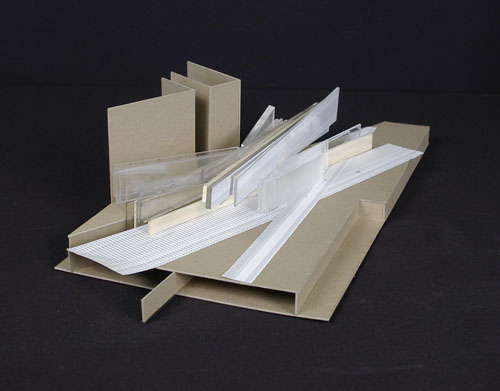 "The cultural identity of MIT exists within its intricate network of corridors which extend 'infinitely' above and below ground throughout the campus. The proposed Student Center would introduce a spatial interruption along this corridor system. The design process began with a spatial exploration of the 'corridor', investigating the qualities that exist within it. Qualities of tension, compression and gravitation exist alongside the experiential movement found within the space of the corridor." (PDF)