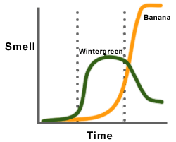 Graph of smell vs. time, showing wintergreen smell growth followed by its decay while banana smell grows to plateau.