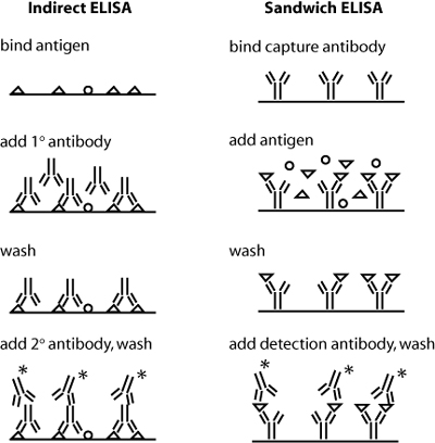Schematics of indirect and sandwich ELISA. Triangles indicate the protein of interest, and * indicates a conjugated enzyme for later detection. (Blocking step not shown.)