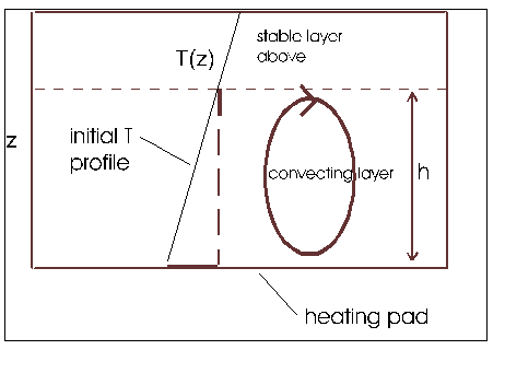 If the initial fluid is unstratified, then buoyant fluid rises from the heating pad right up to the free surface. There is no ambient stratification to constrain vertical motion. The picture on the right zooms in on the convective plumes.