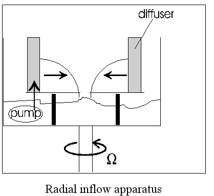 When the apparatus is not rotating, water flows radially inward from the diffuser to the drain in the middle. When the apparatus is rotating, however, water in the interior conserves angular momentum and, in so doing, acquires a vigorous swirling motion. The water spirals inward, as sketched in the diagram. The centrifugal force directed radially outward is balanced by a pressure gradient force directed radially inward. This pressure gradient force is set up by the free surface tilting relative to the horizontal.