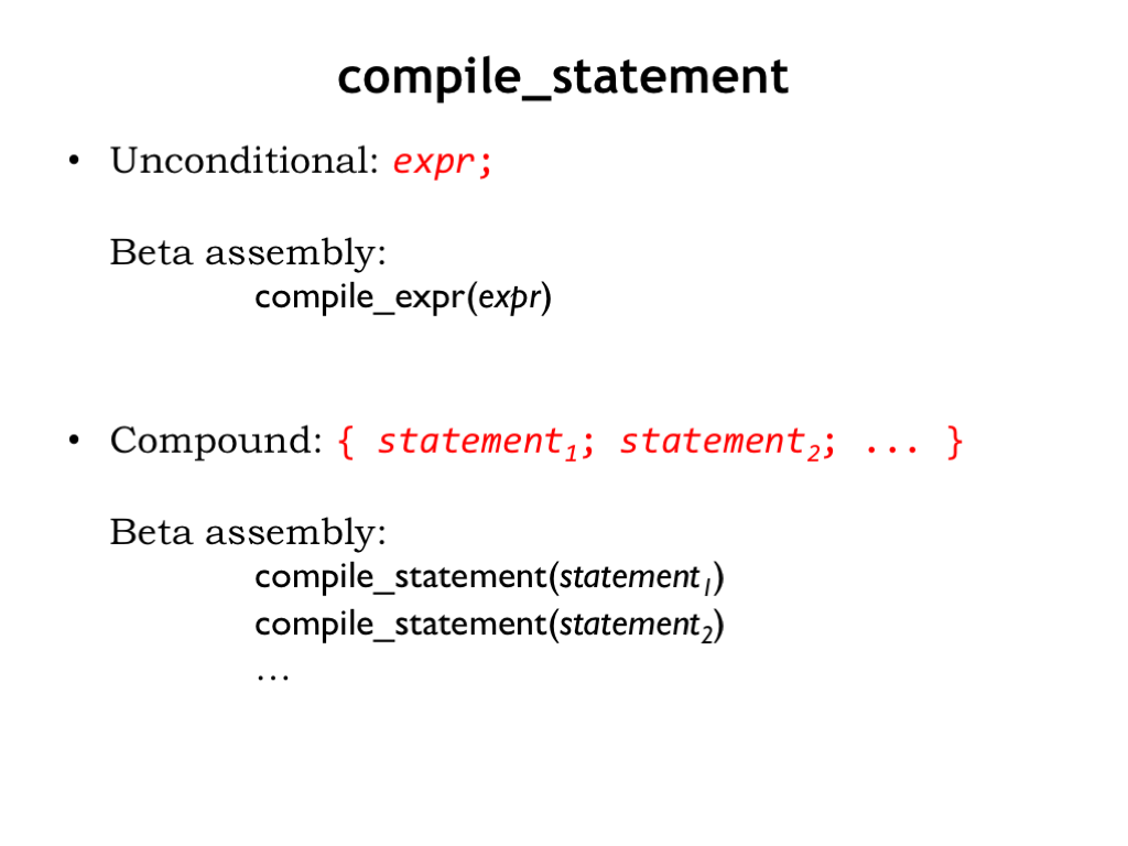 Compound statements are equally easy. We’ll recursively call compile_statement to generate code for each statement in turn. The code for statement_2 will immediately follow the code generated for statement_1. Execution will proceed sequentially through the code for each statement.