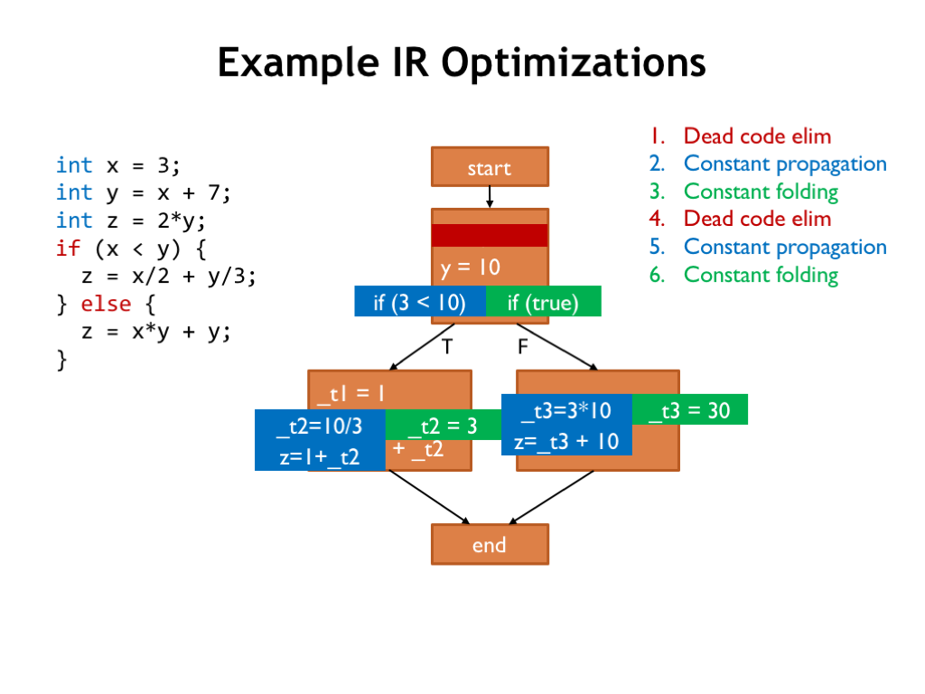 We’ll optimize the IR by performing multiple passes over the CFG. Each pass performs a specific, simple optimization. We’ll repeatedly apply the simple optimizations in multiple passes, until the we can’t find any further optimizations to perform. Collectively, the simple optimizations can combine to achieve very complex optimizations.