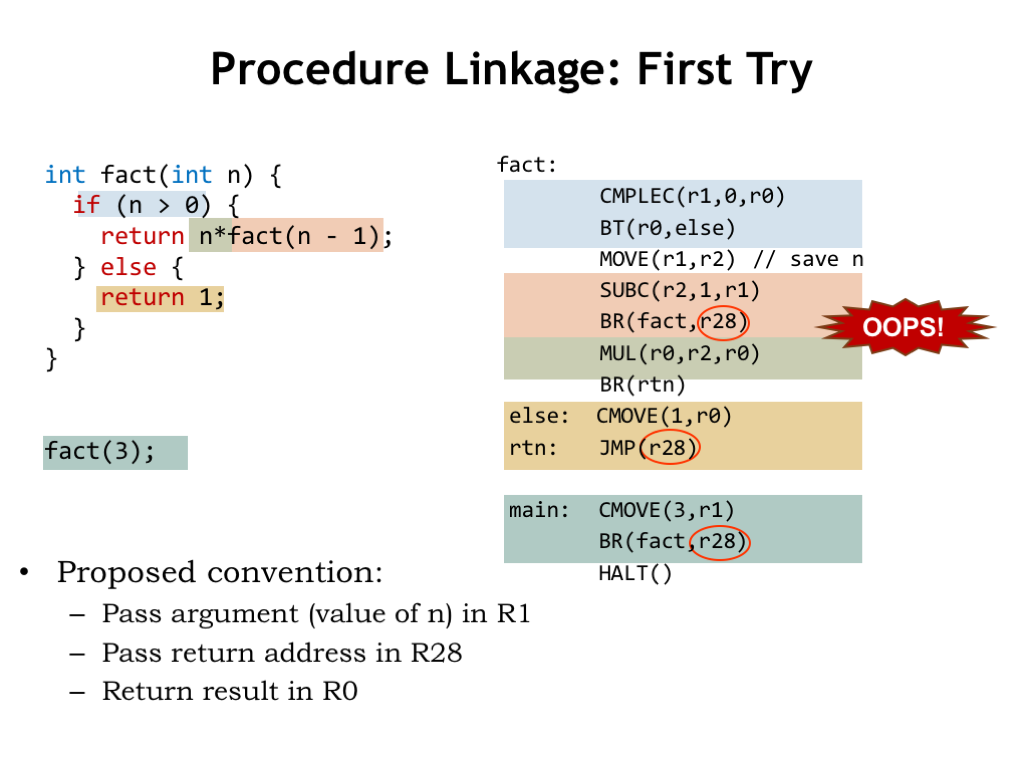 For example, note that following our calling convention, the recursive call also uses R28 to store the return address. When executed, the code for the original call stored the address of the HALT instruction in R28. Inside the procedure, the recursive call will store the address of the MUL instruction in R28. Unfortunately that overwrites the original return address.