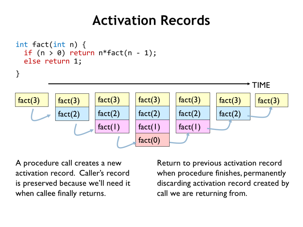 The recursion terminates with fact(0), which returns the value 1 to its caller. At this point we’ve finished execution of fact(0) and so its activation record is no longer needed and can be discarded.