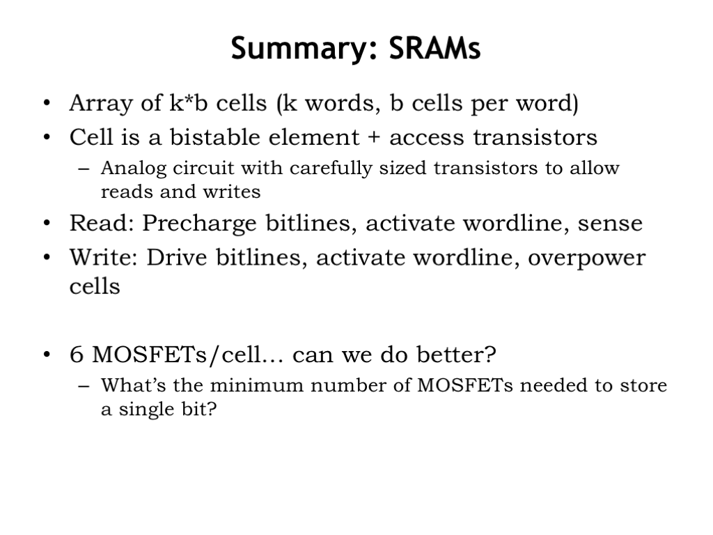 Our registers are built from sequential logic and provide very low latency access (20ps or so) to at most a few thousands of bits of data. Static and dynamic memories, which we’ll discuss further in the coming slides, offer larger capacities at the cost of longer access latencies. Static random-access memories (SRAMs) are designed to provide low latencies (a few nanoseconds at most) to many thousands of locations. Already we see that more locations means longer access latencies — this is a fundamental size vs. performance tradeoff of our current memory architectures. The tradeoff comes about because increasing the number of bits will increase the area needed for the memory circuitry, which will in turn lead to longer signal lines and slower circuit performance due to increased capacitive loads.