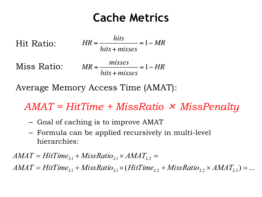 Using these metrics we can compute the average memory access time (AMAT). Since we always check in the cache first, every access includes the cache access time (called the hit time). If we miss in the cache, we have to take the additional time needed to access main memory (called the miss penalty). But the main memory access only happens on some fraction of the accesses: the miss ratio tells us how often that occurs.