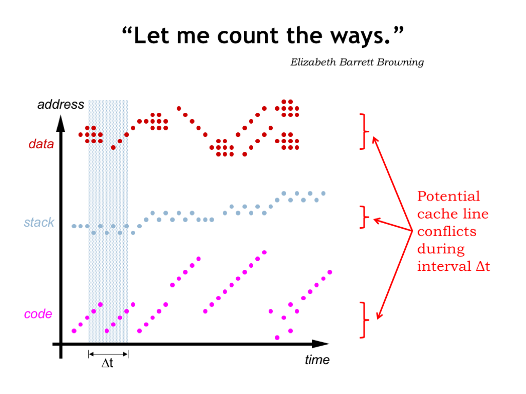 The mapping from addresses to cache lines is designed to avoid conflicts between neighboring locations. So we only need to worry about conflicts between the different regions: code, stack and data. In the examples shown here there are three such regions, maybe 4 if you need two data regions to support copying from one data region to another. If the time interval is particularly large, we might need double that number to avoid conflicts between accesses early in the time interval and accesses late in the time interval.