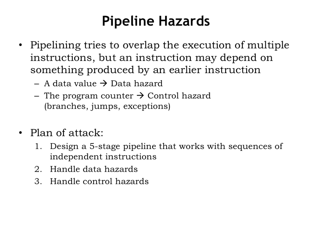 We’ll start by designing a 5-stage pipeline that works with sequences of instructions that don’t trigger hazards, i.e., where instruction execution doesn’t depend on earlier instructions still in the pipeline.
