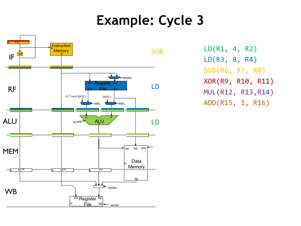 In cycle 4, we’re overlapping the execution of four instructions. The MEM stage initiates a memory read for the green LD instruction. Note that the read data will first become available in the WB stage - it’s not available to CPU in the current clock cycle.