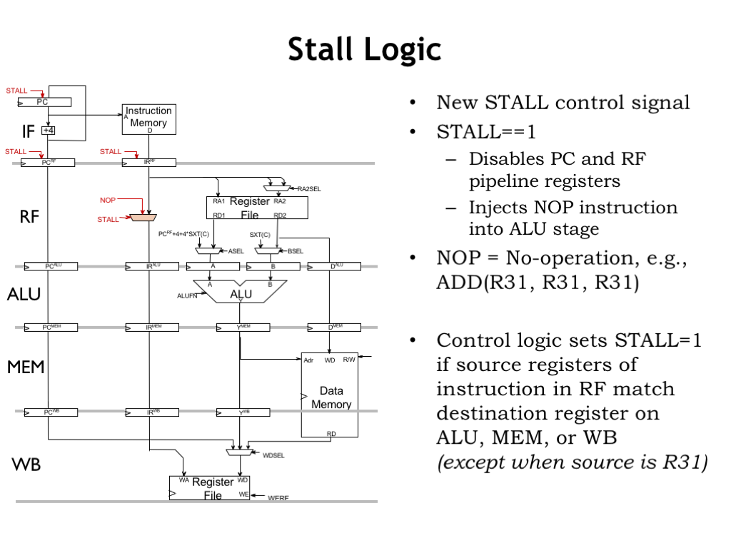 To implement stalling, we only need to make two simple changes to our pipelined data path. We generate a new control signal, STALL, which, when asserted, disables the loading of the three pipeline registers at the input of the IF and RF stages, which means they’ll have the same value next cycle as they do this cycle. We also introduce a mux to choose the instruction to be sent along to the ALU stage. If STALL is 1, we choose a NOP instruction, e.g., an ADD with R31 as its destination. If STALL is 0, the RF stage is not stalled, so we pass its current instruction to the ALU.