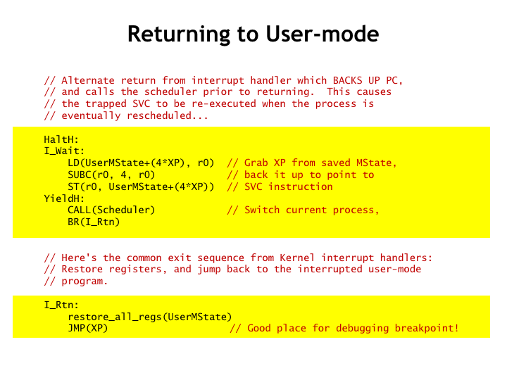 You can see that this code also serves as the implementation for two different SVCs! A process can give up the remainder of its current execution time slice by calling the Yield() SVC. This simply causes the OS to call Scheduler(), suspending execution of the current process until its next turn in the round-robin scheduling process.
