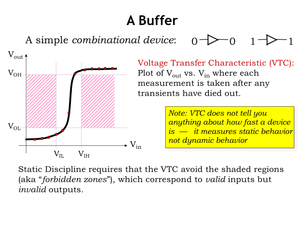 If we proceed to make all the additional measurements, we get the voltage transfer characteristic of the buffer, shown as the black curve on the graph. Notice that the curve does not pass through the shaded regions, meeting the expectations we set out above for the behavior of a legal combinational device.