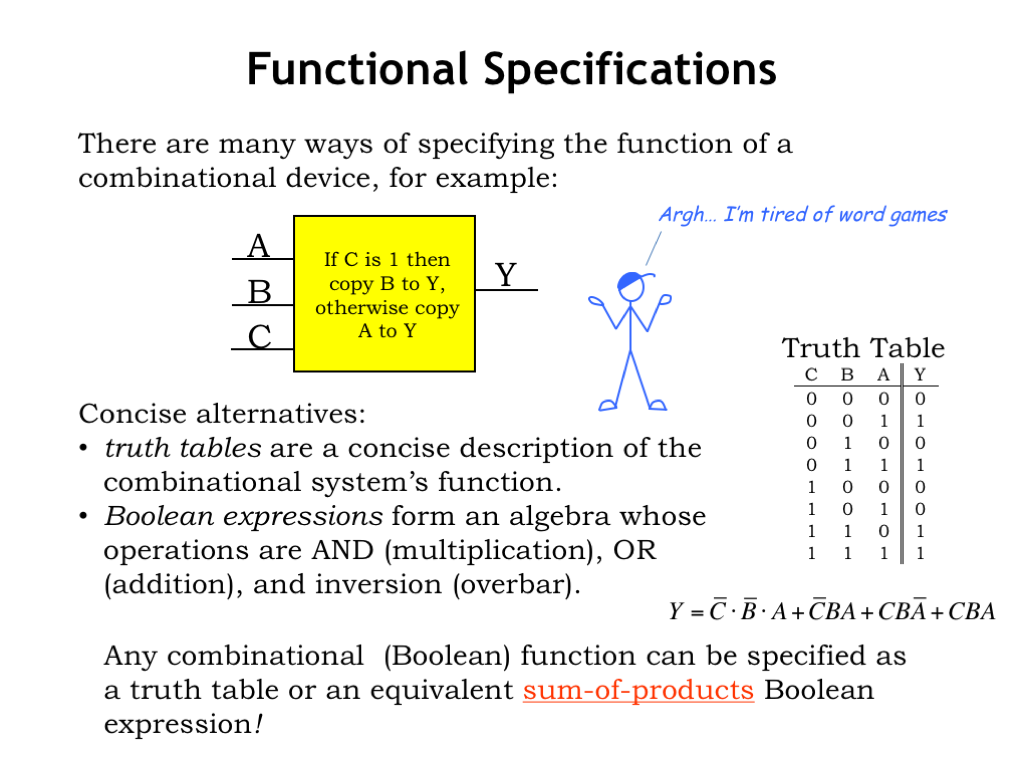 A functional specification is part of the static discipline we use to build the combinational logic abstraction of a circuit. One approach is to use natural language to describe the operation of a device. This approach has its pros and cons. In its favor, natural language can convey complicated concepts in surprisingly compact form and it is a notation that most of us know how to read and understand. But, unless the words are very carefully crafted, there may be ambiguities introduced by words with multiple interpretations or by lack of completeness since it’s not always obvious whether all eventualities have been dealt with.