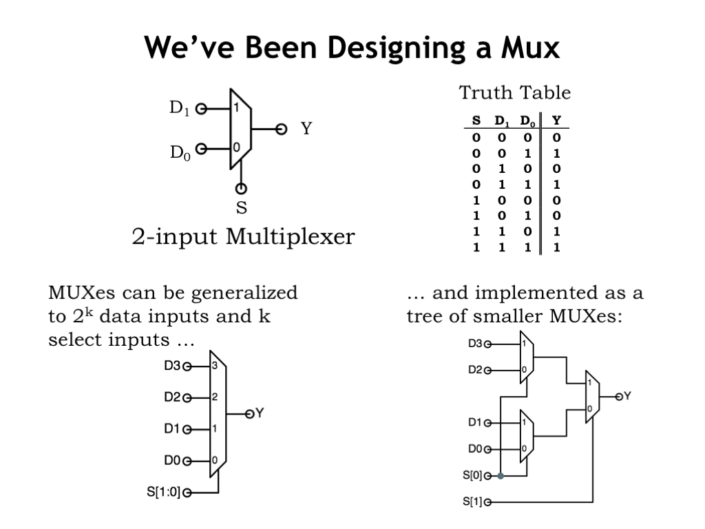 So MUXes with N select lines are effectively stand-ins for N-input logic circuits. Such a MUX would have \(2^N\) data inputs. They’re useful for N up to 5 or 6, but for functions with more inputs, the exponential growth in circuit size makes them impractical.