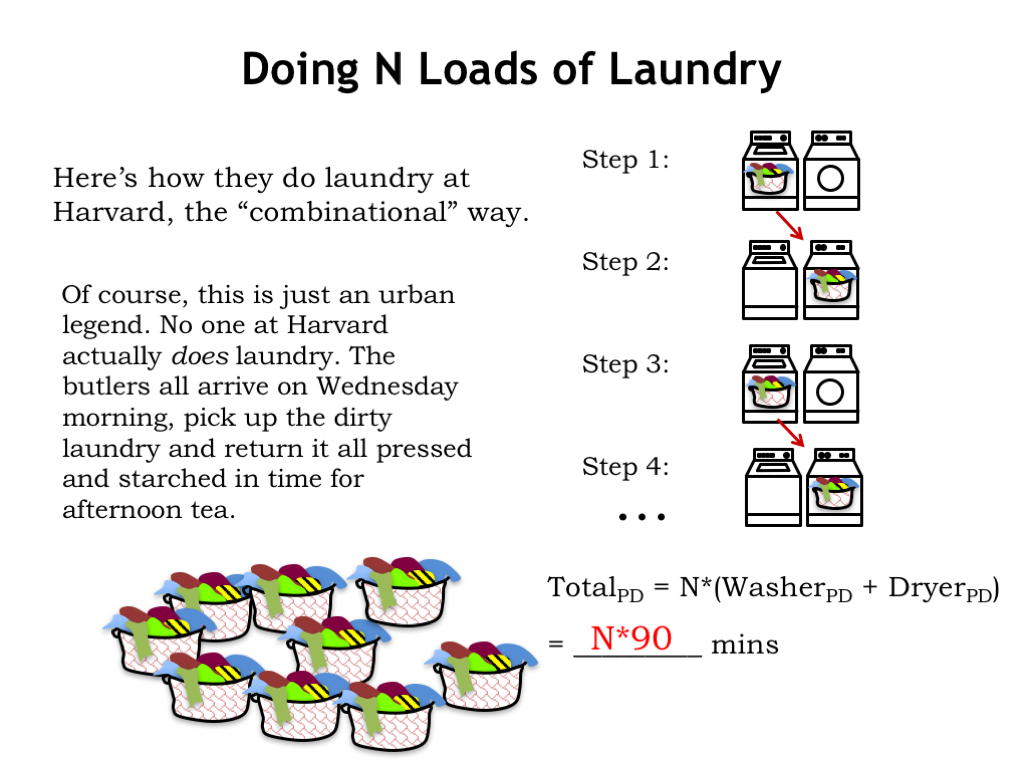Here at MIT we like to make gentle fun of our colleagues at the prestigious institution just up the river from us. So here’s how we imagine they do N loads of laundry at Harvard. They follow the combinational recipe of supplying new system inputs after the system generates the correct output from the previous set of inputs. So in step 1 the first load is washed and in step 2, the first load is dried, taking a total of 90 minutes. Once those steps complete, Harvard students move on to step 3, starting the processing of the second load of laundry. And so on...
