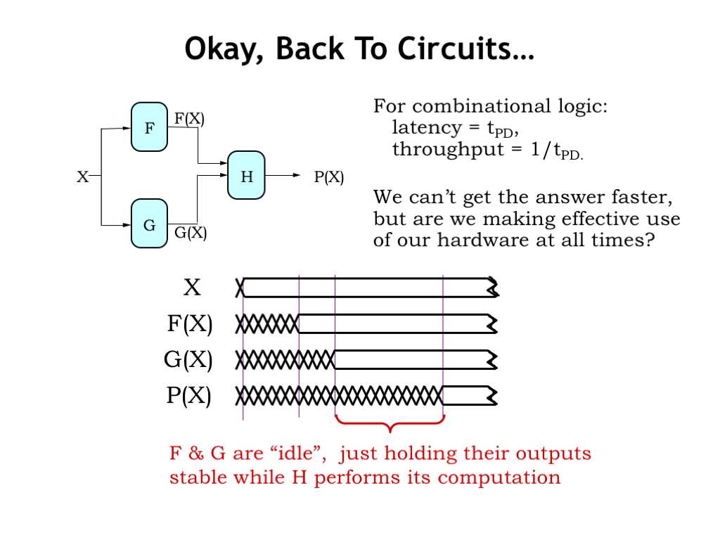 But what about the system’s throughput? Observe that after producing their outputs, the F and G modules are sitting idle, just holding their outputs stable while H performs its computation. Can we figure out a way for F and G to get started processing the next input while still letting H do its job on the first input? In other words, can we divide the processing of the combinational circuit into two stages where the first stage computes F(X) and G(X), and the second stage computes H(X)? If we can, then we can increase the throughput of the system.