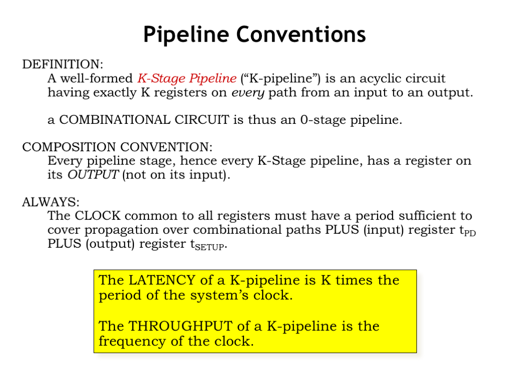 To make it easy to build larger pipelined systems out of pipelined components, we’ll adopt the convention that every pipeline stage, and hence every K-stage pipeline, has a register on its OUTPUT.