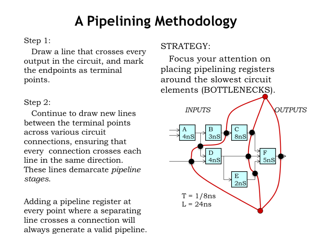 Here’s our strategy that will ensure if we add a pipeline register along one path from system inputs to system outputs, we will add pipeline registers along every path.