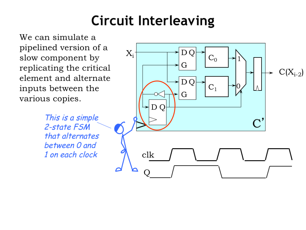 Here’s a circuit for a general-purpose two-way interleaver, using, in this case, two copies of the unpipelined C component, \(C_0\) and \(C_1\).