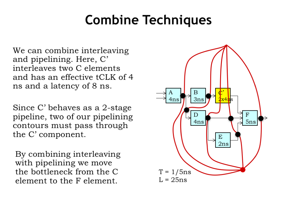 Returning to the example of the previous section, we couldn’t improve the throughput of our pipelined system past 1/8 ns since the minimum clock period was set the by the 8 ns latency of the C module.