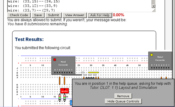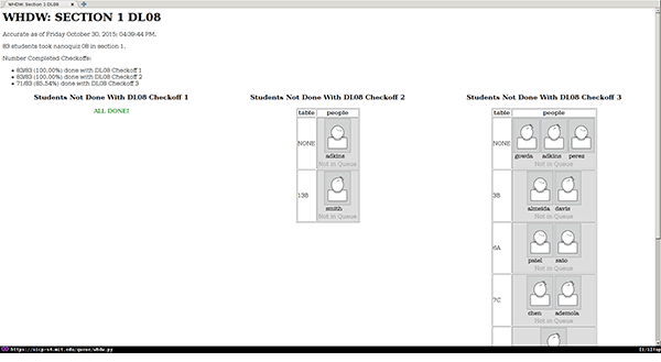 “Check-offs” are particular points in the lab where we say to students, “Okay. You’ve now done all this work. At this point, you should be ready to have a discussion with the teaching staff about key concepts.” We basically conduct a brief and informal oral exam with them. It’s also an opportunity for the teaching staff to make sure the students have built their circuits correctly, because they’re going to use them for the entire lab. At the end of the check-off, if the staff member is satisfied that the students understand the material, he or she electronically records that the students have completed that particular part of the lab. The check-offs are not graded, but their completion does count toward students’ final grades.