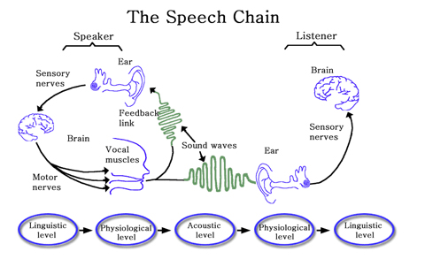 Study of speech often summarized as the study of a chain of events, beginning with what goes on in a speaker's brain to plan an utterance, moving through the acoustics of speech and ending with the steps in the listener's brain that result in comprehension of the utterance: