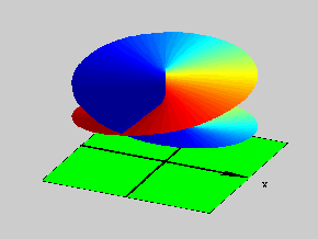 The reason is as follows: when joining the two cut planes to make the surface, we have to join the lower lip of the cut in one plane with the upper in the other (and conversely). But this cannot be done within three dimensional space, since once we join one pair of lips, the members of the other pair end up on different sides of the surface. To join this second pair, we must go into the "fourth dimension" (this is exactly the same sort of difficulty you would find if you try to make a knot in a curve while staying on a plane). What this all means is that: the Riemann Surface for the square root is an object in four dimensional space. In the pictures we have color coded the surface: at the (inevitable in three dimensions) crossings each of the two sheets that cross have a clearly distinct coloring (this is the best we could do with our 4-D coloring pens broken).