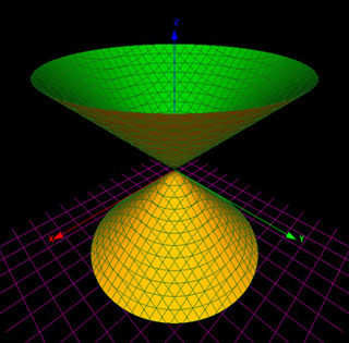 Plot of the equation V(z2-x2-y2). The resulting cone is an example of a singular affine variety. (Image made using K3DSurf by Prof. Steven Kleiman.)
