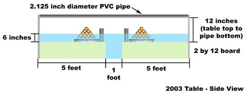 4. Cross Rails and Side Walls - The only connections between the two tables are a pair of round horizontal bars and the side walls of the table. These PVC bars span the entire length of the table, from behind one starting zone to the corresponding scoring zone. The PVC pipe has a diameter of 2-1/8 inches. The rail area contained within the starting zone is considered part of the starting zone. Contestants may start the contest clamped to the sidewalls and/or the rail.