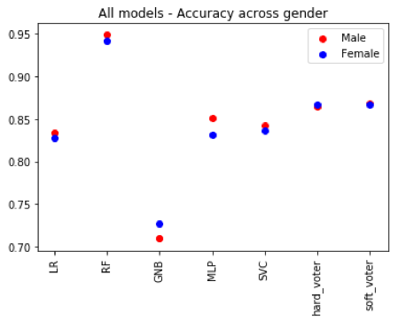 Different ML models show different levels of bias. By changing the model type and architecture, we can observe which ones will be less biased for this application. We examine single and multi-model architectures. The models that will be considered are support vector, random forest, KNN, logistic regression, and MLP classifiers. Multi-model architectures involve training a group of different models that make a final prediction based on consensus. Two approaches can be used for consensus; hard voting, where the final prediction is the majority prediction among the models and soft voting, where the final prediction is the average prediction. The following plots show the differences in overall accuracy and the discrepancies between accuracy across gender.
